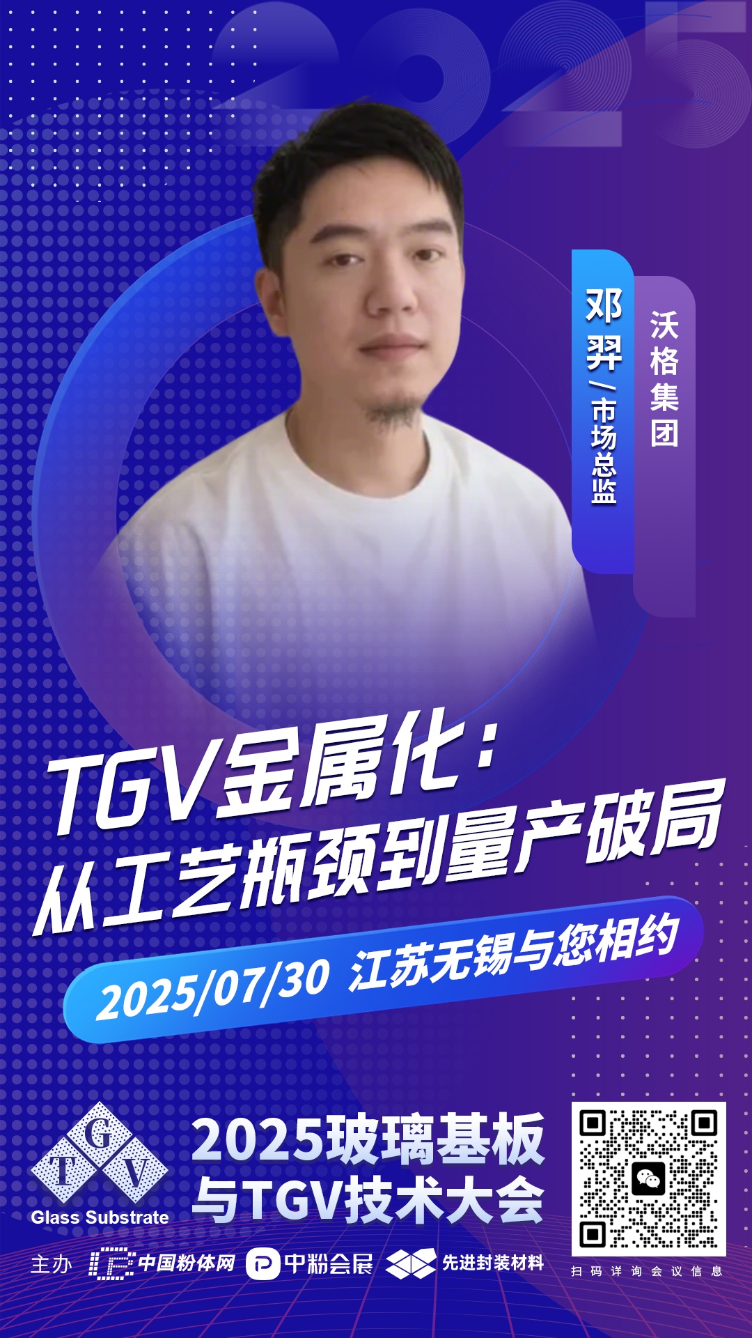 為強化行業(yè)信息交流,中國粉體網(wǎng)將于2025年7月30日在無錫舉辦2025玻璃基板與TGV技術(shù)大會。屆時,沃格集團(tuán)市場總監(jiān)鄧羿將作題為《TGV金屬化:從工藝瓶頸到量產(chǎn)破局》的報告,解析玻璃基板對有機基板的替代邏輯,挖掘全玻璃多層互聯(lián)結(jié)構(gòu)在高頻信號傳輸中的優(yōu)勢,分享TGV在微流控、Mini LED等新興領(lǐng)域的商業(yè)化潛力。