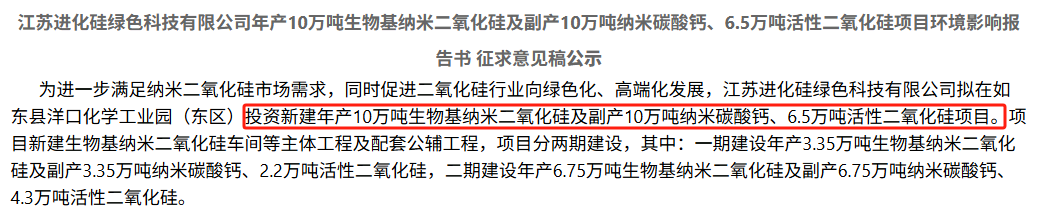 中國粉體網訊 近日,江蘇進化硅綠色科技有限公司年產10萬噸生物基納米二氧化硅及副產10萬噸納米碳酸鈣、6.5萬噸活性二氧化硅項目進入環評公示階段。