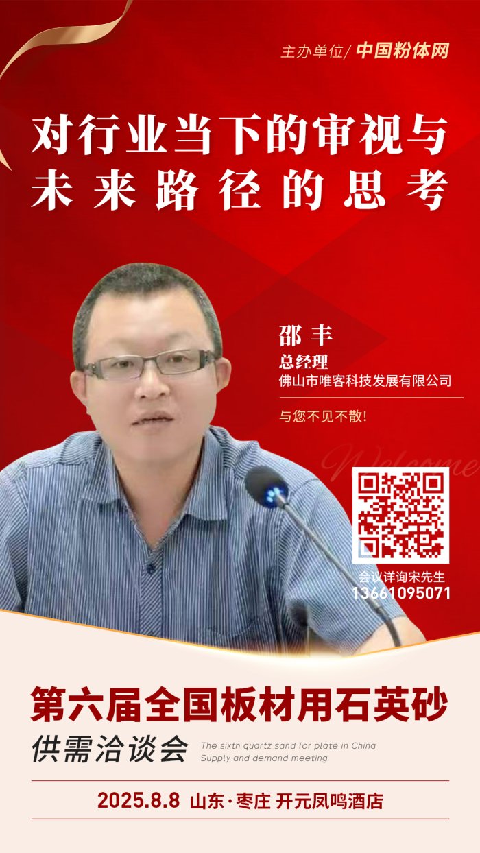 2025年8月8日,由中國粉體網(wǎng)主辦的第六屆全國板材用石英砂供需洽談會即將在山東棗莊召開,佛山市唯客科技發(fā)展有限公司總經(jīng)理邵豐將做《對行業(yè)當下的審視與未來路徑的思考》的報告,屆時,他將圍繞該核心議題展開詳細解讀。