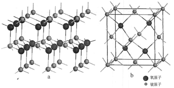 BeO晶體為纖鋅礦型結構,單胞為立方晶系,具有很強的共價鍵。室溫下BeO以α-BeO相存在,是堿土金屬氧化物中唯一的六方纖鋅礦結構,其它堿土金屬氧化物(MgO,CaO,SrO,BaO等)則為NaCl型結構。BeO晶體結構中,每個Be原子與4個O原子形成四面體,或者每個O原子與4個Be原子形成四面體。
