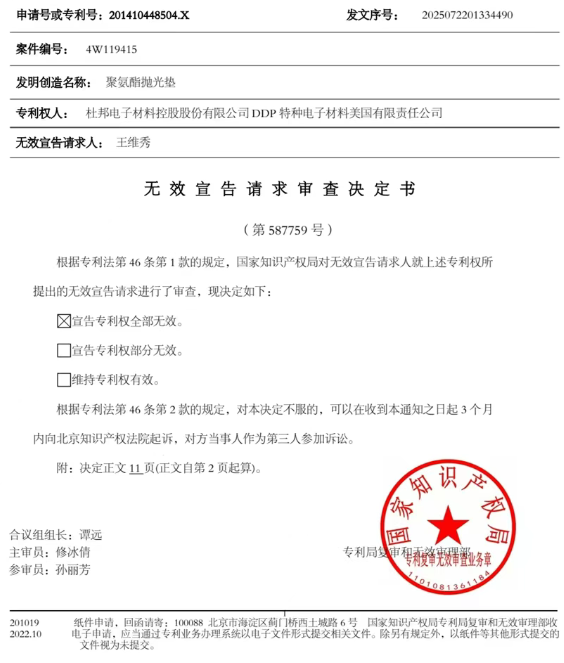 近日,國家知識產權局消息,杜邦電子材料控股股份有限公司、杜邦全資子公司DDP特種電子材料美國有限責任公司擁有的一項名為“聚氨酯拋光墊”的專利(專利號:ZL201410448504.X)因不具備創造性,而被宣告權利要求全部無效。