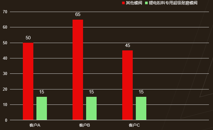 ④綜合計(jì)算,使用鋰電粉料專(zhuān)用超級(jí)耐磨蝶閥使用成本僅為其他蝶閥的30%,可為客戶(hù)節(jié)約70%蝶閥成本。