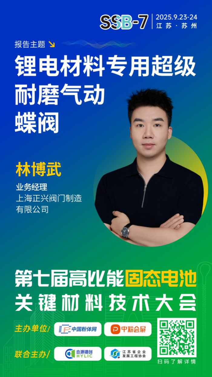 2025年9月23-24日,上海正興閥門(mén)制造有限公司將在中國(guó)粉體網(wǎng)聯(lián)合合源鋰創(chuàng)、江蘇省企業(yè)發(fā)展工程協(xié)會(huì)舉辦的第七屆高比能固態(tài)電池關(guān)鍵材料技術(shù)大會(huì)上進(jìn)行產(chǎn)品展示,并且公司業(yè)務(wù)經(jīng)理林博武將作題為《鋰電材料專(zhuān)用超級(jí)耐磨氣動(dòng)蝶閥》的報(bào)告,歡迎業(yè)界同仁前來(lái)參觀交流。