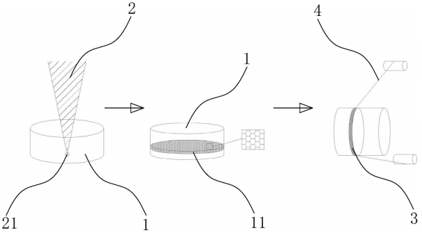本發明公開了一種大尺寸金剛石的切割方法,包括有以下步驟:S1、在金剛石上選定需要切割的分離面;S2、激光的入射方向與分離面處于非平行狀態,將激光的焦點聚焦在分離面上;S3、僅將分離面上的金剛石進行石墨化形成石墨層,激光焦點在加工范圍內進行非完全石墨化,單位空間內的晶體石墨化比例介于20%到95%之間;S4、用線鋸對石墨層進行切割,將金剛石從分離面處分離。在本申請中并不采用激光直接進行切割方式,而是對激光在加熱金剛石過程中能夠形成石墨層的方式進行利用,通過線切割的方式能夠將石墨層進行切割,提高了加工效率。