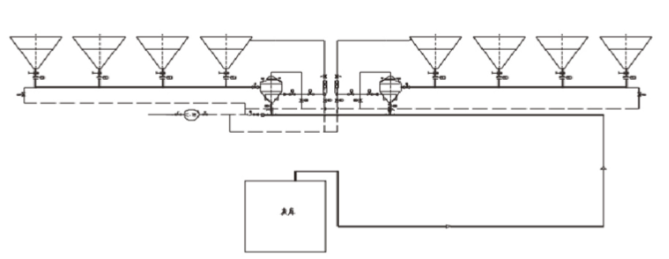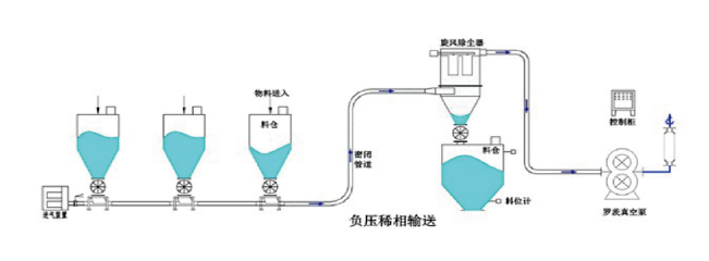 負(fù)壓氣力除灰系統(tǒng)系利用抽氣設(shè)備的抽吸作用,使系統(tǒng)內(nèi)形成真空,集灰斗內(nèi)的干灰通過鎖氣器、受灰器,隨吸入一起帶入輸送管道,經(jīng)系統(tǒng)未端的收塵裝置,使氣灰分離,灰存入灰?guī)靸?nèi),經(jīng)凈化后的空氣通過抽氣設(shè)備排入大氣。