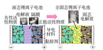 傳統液態鋰離子電池與全固態鋰離子電池示意圖