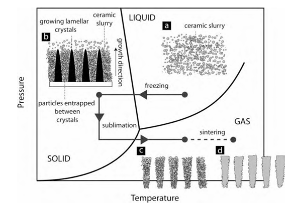 制備原理:將陶瓷料漿中的水等液體介質在低溫下凝固,再通過一定條件的晶體生長,然后在低壓或者真空環境下升華而留下具有晶體形貌的孔道,最后經高溫處理得到特殊微觀結構的多孔陶瓷。