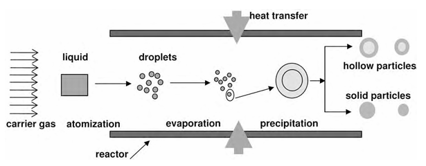 制備原理:噴霧熱解法是使用噴霧發生器將含有溶劑(如水)和含有金屬以及非金屬元素溶質的前驅體溶液轉化為小液滴的噴霧,然后在熱環境中進行溶劑蒸發和溶質沉淀,只要工藝溫度足夠高,就會發生化學分解,形成最后的粉體顆粒。
