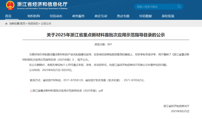 中國粉體網訊 日前,浙江省經濟和信息化廳正式發布《重點新材料首批次應用示范指導目錄(2025年版)》(公示稿)。