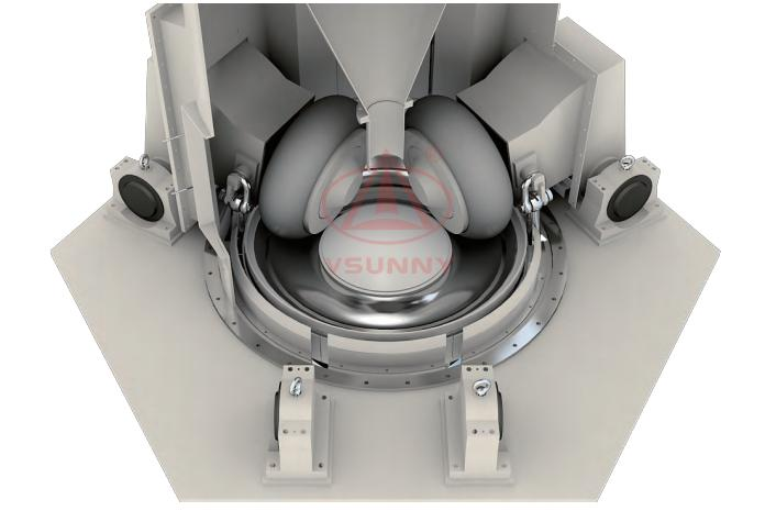 6) 經(jīng)“立磨主機(jī)”研磨后,物料被磨機(jī)內(nèi)強(qiáng)大的負(fù)壓氣流吸起,被抽送到立磨頂部的“氣流分級(jí)機(jī)”中,然后調(diào)整分級(jí)輪的轉(zhuǎn)速對(duì)粉體進(jìn)行分選。細(xì)度合適的粉體會(huì)隨著負(fù)壓氣流一起會(huì)穿過分級(jí)輪,被送至“脈沖除塵器”。而細(xì)度過大的顆粒會(huì)被打回磨盤中繼續(xù)研磨;