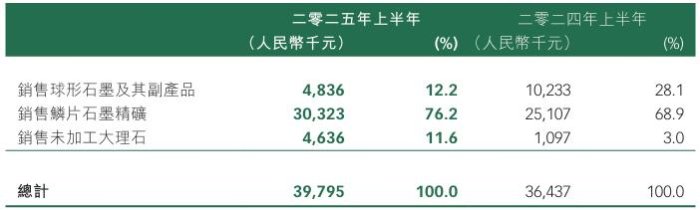 2025年上半年及2024年上半年,銷售鱗片石墨精礦所產生收益分別占總收益的約76.2%及68.9%。