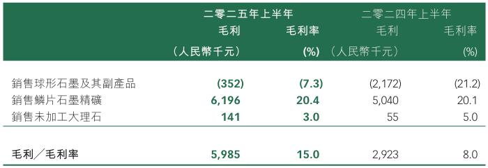 2025年上半年,天然石墨市場仍面臨壓力,原因為市場需求萎縮及價格相對低迷。在2025年上半年的成本控制政策下,公司的生產較2024年上半年更有效率。因此,公司的毛利率由2024年上半年的約8.0%增加至約15.0%,毛利由2024年上半年的約人民幣2.9百萬元增加至約人民幣6.0百萬元。