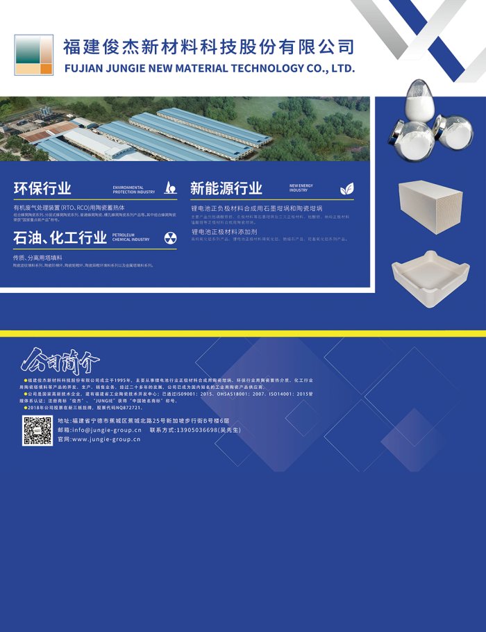 福建俊杰新材料科技股份有限公司成立于1995年,主要從事鋰電池行業正極材料合成用陶瓷坩堝、環保行業用陶瓷蓄熱介質、化工行業用陶瓷塔填料等產品的開發、生產銷售業務。經過二十多年的發展,公司已成為國內知名的工業用陶瓷產品供應商。