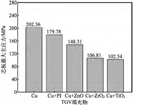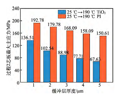 TiO2與PI緩沖層玻璃芯板最大主應力對比 來源:《降低玻璃基板TGV應力的無機緩沖層方法與仿真分析》(趙泉露等)