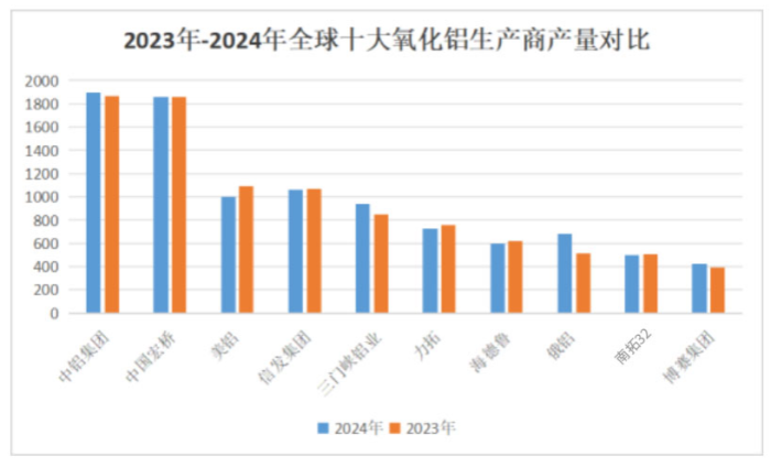 阿拉丁(ALD)統(tǒng)計數(shù)據(jù)顯示,2024年全球十大氧化鋁生產(chǎn)商合計產(chǎn)量約為9694萬噸,同比上漲2.86%。從集團(tuán)數(shù)量看,中外企業(yè)各占五席,其中五家中國企業(yè)集團(tuán)分別是中鋁集團(tuán)、中國宏橋、信發(fā)集團(tuán)、三門峽鋁業(yè)和博賽集團(tuán),合計產(chǎn)量約為6182萬噸,占比為63.77%。