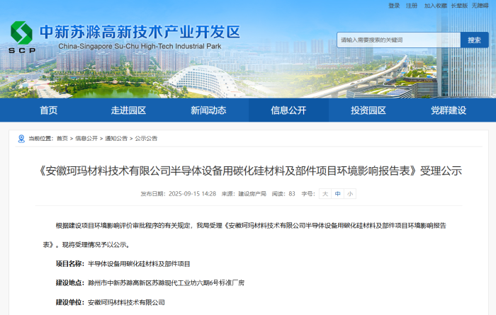 中國粉體網訊 近日,滁州市人民政府發布了關于《安徽珂瑪材料技術有限公司半導體設備用碳化硅材料及部件項目環境影響報告表》受理公示。