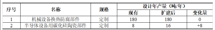 文件顯示,安徽珂瑪科技將在滁州市中新蘇滁高新技術產業開發區蘇滁現代工業坊陸號廠房進行擴建,項目建成后可年產290噸機械設備換熱防腐部件和10噸半導體設備用碳化硅陶瓷部件,目前,年產180噸機械設備換熱防腐部件和8噸半導體設備用碳化硅陶瓷部件生產裝置已建成,已通過自主驗收并完成排污許可登記。由于6號廠房空間限制,剩余110噸機械設備換熱防腐部件和2噸半導體設備用碳化硅陶瓷部件生產線不再建設。