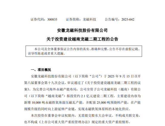 中國粉體網訊 近日,安徽龍磁科技股份有限公司宣布,其全資子公司龍磁科技(越南)有限公司計劃投資約2.1億元人民幣建設二期工程項目,以進一步完善全球產能布局,滿足日益增長的市場需求。
