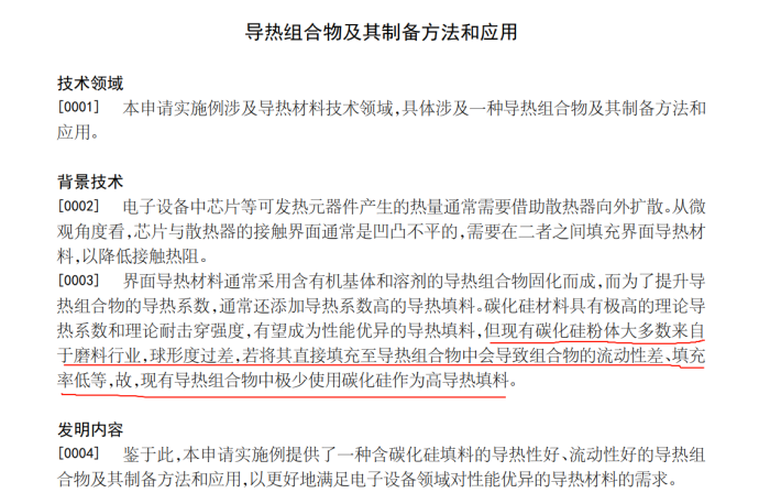 而華為的解釋卻是:現(xiàn)有碳化硅粉體大多數(shù)來自于磨料行業(yè),球形度過差,若將其直接填充至導熱組合物中會導致組合物的流動性差、填充率低等,故現(xiàn)有導熱組合物中極少使用碳化硅作為高導熱填料。
