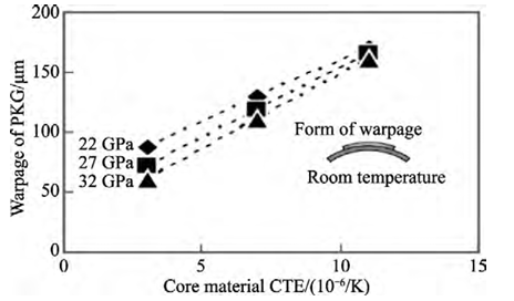 基板核心層材料的CTE對基板翹曲的影響 來源:Jiang. Semiconductor chip and package co-design and assembly for dual use in flip chip and wirebond BGA packages