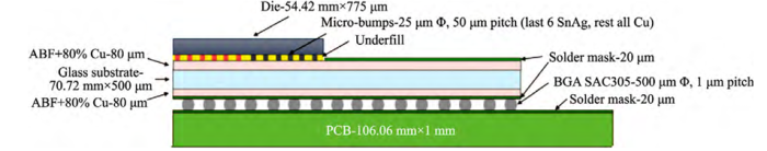 基于大尺寸玻璃基板的封裝示意圖 來源:Surillo.Bayesian optimization of large glass package architecture for system-level reliability in high-performance computing applications