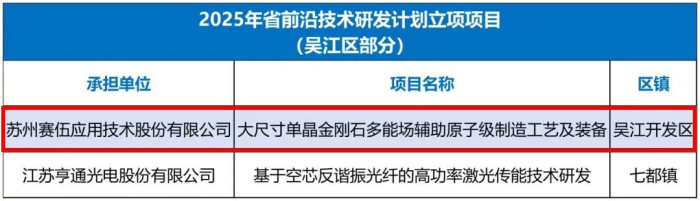 中國粉體網訊 近日,江蘇省科技廳發布了2025年度省前沿技術研發項目立項名單,吳江開發區蘇州賽伍應用技術股份有限公司的大尺寸單晶金剛石多能場輔助原子級制造工藝及裝備項目成功入選。