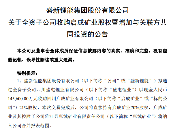 中國粉體網(wǎng)訊 9月23日,盛新鋰能發(fā)布公告稱,公司擬通過全資子公司四川盛屯鋰業(yè)有限公司以現(xiàn)金14.56億元收購四川啟成礦業(yè)有限公司21%股權(quán)。交易完成后,公司將直接持有啟成礦業(yè)70%股權(quán),后者及其控股的雅江縣惠絨礦業(yè)有限責任公司(簡稱“惠絨礦業(yè)”)將納入公司合并報表范圍。
