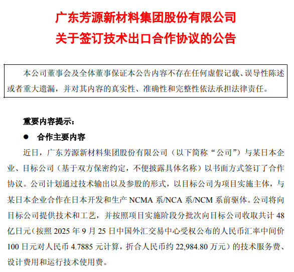 芳源股份將向目標公司提供技術和工藝,并分批收取共計48億日元(折合人民幣約2.29億元)的技術服務費等費用。2025年4月,公司已收取13,225萬日元信息提供費及開發費,預計2025年內可收取的技術服務費、設計費用和運行技術使用費共計12.4億日元。