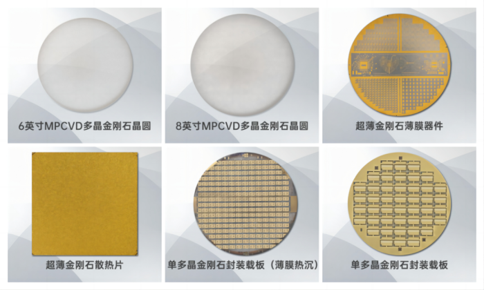 黃河旋風是國內超硬材料領域的龍頭企業之一,歷史悠久的行業先驅。擁有從人造金剛石、立方氮化硼到各類金剛石制品(如鋸切、磨削工具)的完整產業鏈。在培育鉆石領域也是重要的參與者。2025年初,黃河旋風成功生長出半導體用5-30μm超薄6-8英寸多晶金剛石晶圓熱沉材料,厚度0.02-1mm,均勻性好,熱導率1000-2200W/m·K。2025年5月,黃河旋風與博志金鉆合資成立河南乾元芯鉆半導體科技有限公司,研發金剛石散熱材料及器件,推動大尺寸金剛石制備和高端封裝。接下來,黃河旋風將重點突破12英寸多晶金剛石晶圓熱沉材料制備技術。