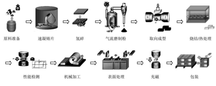 燒結(jié)釹鐵硼的制備采用典型的粉末冶金工藝,主要包括以下步驟: