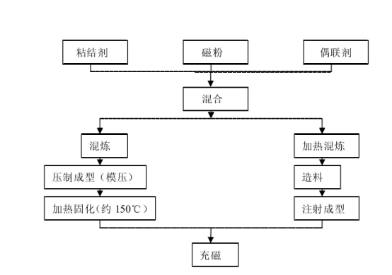粘結(jié)釹鐵硼是由釹鐵硼永磁粉末與橡膠、塑料等粘結(jié)材料混合,按用戶需求直接成型為各類(lèi)永磁部件的功能材料。其主要制備工藝包括:
