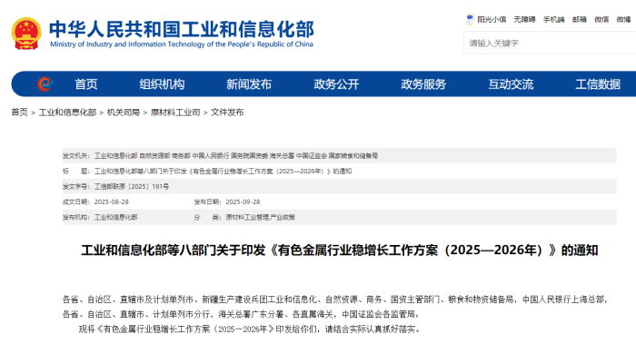 中國粉體網訊 9月28日,工業和信息化部聯合自然資源部、商務部、中國人民銀行、國務院國資委、海關總署、中國證監會和國家糧食和儲備局等八部門印發《有色金屬行業穩增長工作方案(2025—2026年)》。