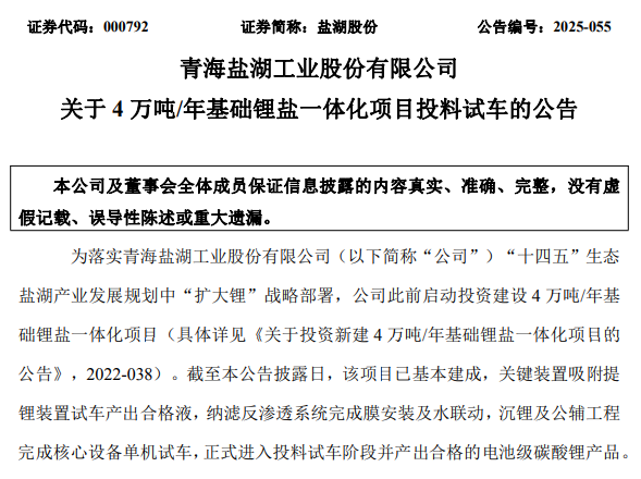 中國粉體網(wǎng)訊 9月29日,鹽湖股份發(fā)布公告稱,公司此前啟動投資建設(shè)4萬噸/年基礎(chǔ)鋰鹽一體化項目已基本建成,關(guān)鍵裝置吸附提鋰裝置試車產(chǎn)出合格液,納濾反滲透系統(tǒng)完成膜安裝及水聯(lián)動,沉鋰及公輔工程完成核心設(shè)備單機(jī)試車,正式進(jìn)入投料試車階段并產(chǎn)出合格的電池級碳酸鋰產(chǎn)品。