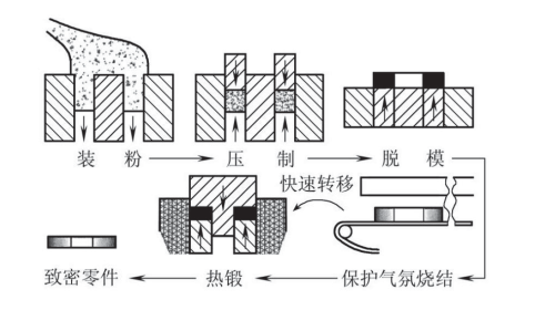 與傳統鍛造工藝不同的是,粉末鍛造先利用粉末冶金方法制備具有一定形狀的預成形坯,再將預成形坯置于保護氣氛或真空環境下加熱至一定溫度,然后快速轉移至經過預熱的閉式鍛模中進行鍛造。