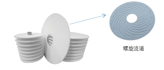 碟式陶瓷膜是一種新興的陶瓷膜構(gòu)型,具有盤(pán)式的外部形狀,內(nèi)部有弧形的清液滲透通道,分離層在碟式陶瓷膜的外表面。滲透液通過(guò)陶瓷膜表面的分離層進(jìn)入內(nèi)部的滲透通道,通過(guò)中空的中心連接軸將滲透液匯集并排出。較于平板陶瓷膜和管式陶瓷膜,碟式陶瓷膜可以在低跨膜壓差(TMP)下通過(guò)膜片自身旋轉(zhuǎn)產(chǎn)生高膜面流速,實(shí)現(xiàn)膜面流速與TMP的獨(dú)立控制,有效降低濃差極化和緩解膜污染,實(shí)現(xiàn)高效過(guò)濾。同時(shí),高精度的平面標(biāo)準(zhǔn)確保了低振動(dòng)和在旋轉(zhuǎn)系統(tǒng)中使用的長(zhǎng)壽命。