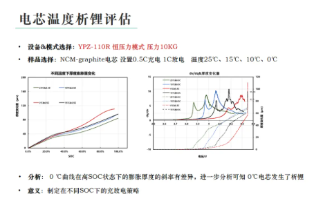 設備由伺服電機施壓機構、壓力測試機構、溫度控制系統、數據采集系統、數據處理軟件等部分組成。工作時可以由高低溫箱控制測試腔內溫度,通過充放電設備設置所需的工步,在電芯施加恒定壓力或者恒定間隙的同時,壓力測試機構或高精度測厚機構自動采集膨脹力或者膨脹厚度數據。