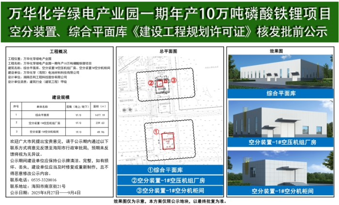 萬華化學電池材料產業園項目自2025年2月簽約以來進展迅速,環評已于4月獲批。進入下半年,項目道路、土建及設備安裝等工程陸續啟動招標,標志著項目進入全面建設階段。