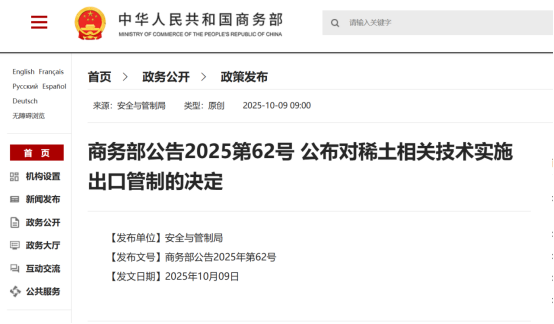 中國粉體網訊 為維護國家安全和利益,根據《中華人民共和國出口管制法》《中華人民共和國兩用物項出口管制條例》等法律法規,經國務院批準,商務部于2025年10月9日連續發布第61號和第62號公告,分別對稀土相關技術及境外相關稀土物項實施出口管制。