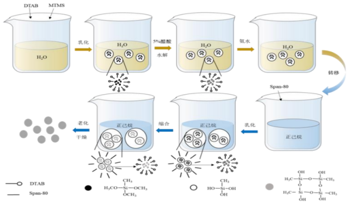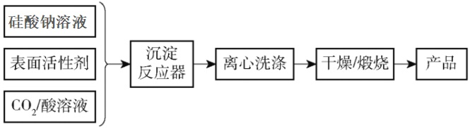 采用硅酸鈉/鉀與二氧化碳或酸溶液(鹽酸、硫酸或硝酸)作為原料,在一定的合成溫度和表面活性劑的作用下混合反應,得到偏硅酸沉淀,再經過濾、洗滌、干燥、煅燒工藝制備出SiO2。