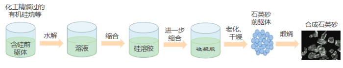 以無機鹽或有機硅烷為原料,以醇作為共溶劑,加入酸或堿作為催化劑,進行水解,縮聚反應,形成含硅凝膠,對凝膠進行老化、脫水、干燥、煅燒等處理,得到合成石英砂。