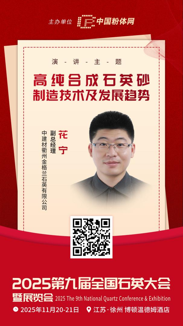 2025年11月20-21日,由中國粉體網主辦的“2025第九屆全國石英大會暨展覽會”將在江蘇徐州召開,中建材衢州金格蘭石英有限公司的花寧副總經理將做《高純合成石英砂制造技術及發展趨勢》的報告,屆時,他將結合公司在高純合成石英砂領域的實際研發經驗,針對當前行業關注的技術難點、制備工藝優化方向以及未來發展趨勢等關鍵問題進行詳細解讀,為行業同仁提供極具價值的參考與借鑒。