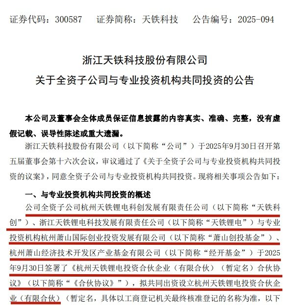 據公告消息,天鐵科技全資子公司杭州天鐵鋰電科創發展有限責任公司(簡稱:天鐵科創)、浙江天鐵鋰電科技發展有限責任公司(簡稱:天鐵鋰電)與專業投資機構杭州蕭山國際創業投資發展有限公司(簡稱:蕭山創投基金)、杭州蕭山經濟技術開發區產業基金有限公司(簡稱:經開基金)于2025年9月30日簽署了《杭州天鐵鋰電投資合伙企業(有限合伙)(暫定名)合伙協議》,擬共同出資設立杭州天鐵鋰電投資合伙企業(有限合伙)(暫定名,具體以工商登記機關最終核準登記的名稱為準,簡稱“合伙企業”)。
