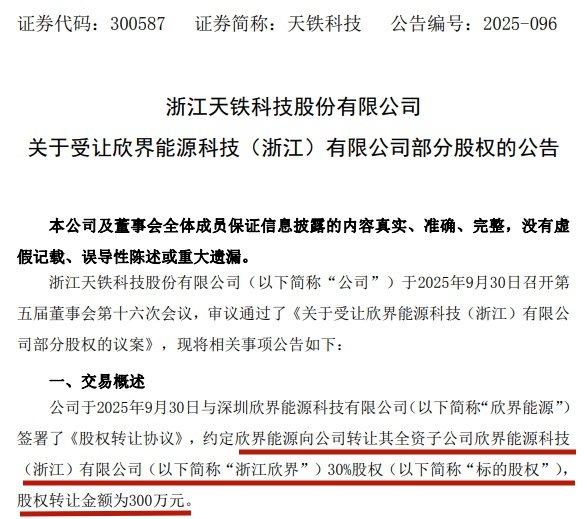 據公告消息,2025年9月30日,天鐵科技與欣界能源簽署了《股權轉讓協議》,約定欣界能源向天鐵科技轉讓其全資子公司浙江欣界30%股權,股權轉讓金額為300萬元。