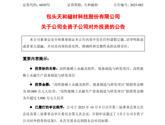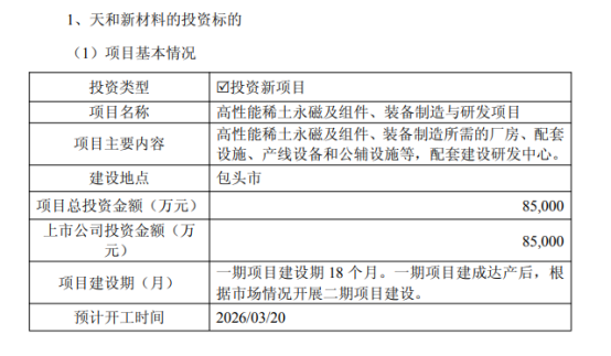 天和磁材本次投資計劃包含兩個并行項目。全資子公司天和新材料將投資8.5億元,建設高性能稀土永磁及組件、裝備制造與研發項目。