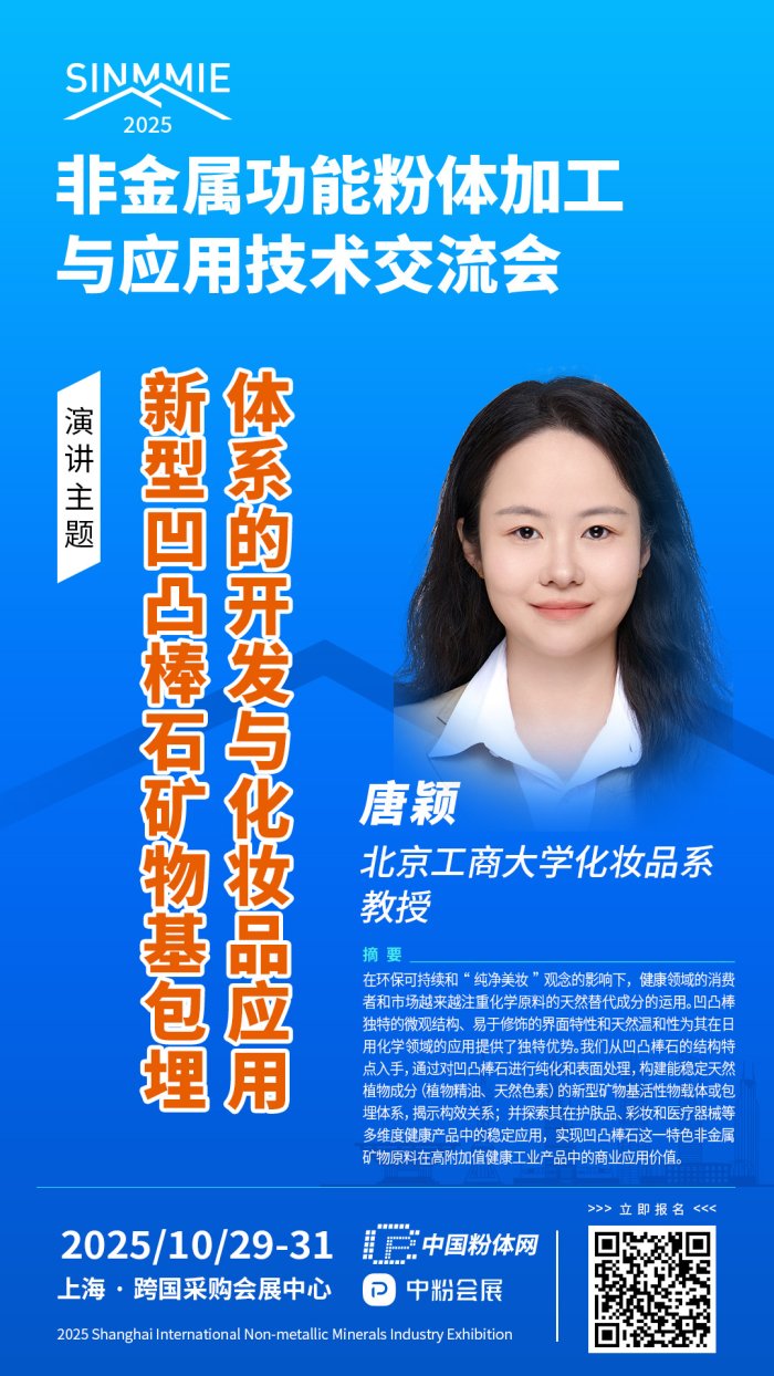 有業內人士指出,在化妝品領域,凹凸棒石正在從傳統的吸附劑、增稠劑,向高性能防曬載體、活性物緩釋平臺和智能護膚系統等高附加值方向轉變,發展潛力不斷釋放。10月29-31日,北京粉體技術協會、柏德英思展覽(上海)有限公司、山東中粉會展服務有限公司將在上?鐕少彆怪行穆摵现鬓k“上海國際非金屬礦工業展覽會(SINMMIE2025)”,展會現場將同期舉辦“非金屬功能粉體加工與應用技術交流會”,屆時將邀請北京工商大學唐穎教授作《新型凹凸棒石礦物基包埋體系的開發與化妝品應用》專題報告,分享凹凸棒石純化和表面處理技術,新型礦物基活性物載體或包埋體系構建和應用技術,并探索其在護膚品、彩妝和醫療器械等多維度健康產品中的穩定應用等內容。