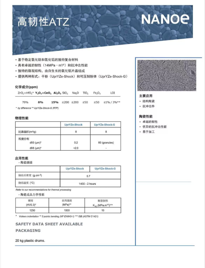 不想放棄氧化鋯的高韌性優點,同時還要彌補其強度、硬度等方面的不足,法國NANOE公司選擇采用氧化鋁來增強氧化鋯基體的方法,推出了適用于定位銷的高韌性ATZ粉體。