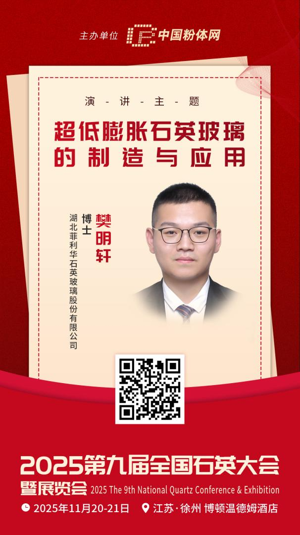 2025年11月20-21日,由中國粉體網主辦的“2025第九屆全國石英大會暨展覽會”將在江蘇徐州召開,湖北菲利華石英玻璃股份有限公司的樊明軒博士將做《超低膨脹石英玻璃的制造與應用》的報告,屆時,他將詳細解讀超低膨脹石英玻璃的制造與應用等關鍵問題,為行業同仁提供極具價值的參考與借鑒。
