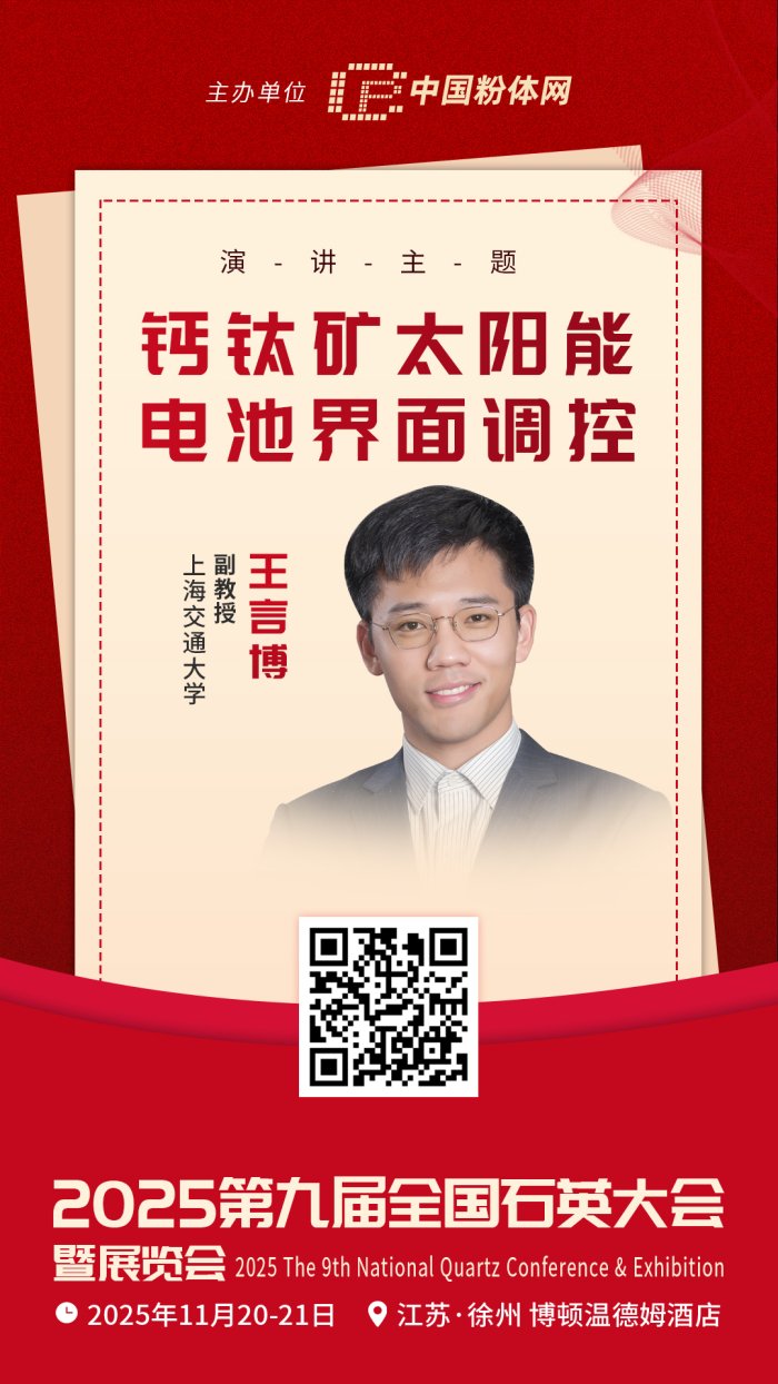 2025年11月20-21日,中國粉體網將在江蘇徐州舉辦“2025(第九屆)全國石英大會暨展覽會”。屆時,上海交通大學副教授王言博將帶來題為《鈣鈦礦太陽能電池界面調控》的報告,為相關領域研究提供交流與參考。