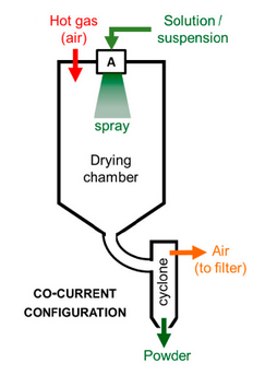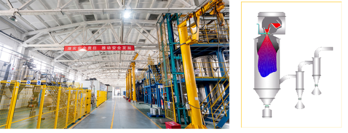 噴霧干燥法是將液態(tài)物質霧化為液滴,隨后在熱氣流中水分迅速蒸發(fā),從而凝固為固態(tài)顆粒,噴霧干燥法的優(yōu)點在于工藝簡單,產(chǎn)物性能易于控制,該方法主要應用于軍工炸藥與電池領域。