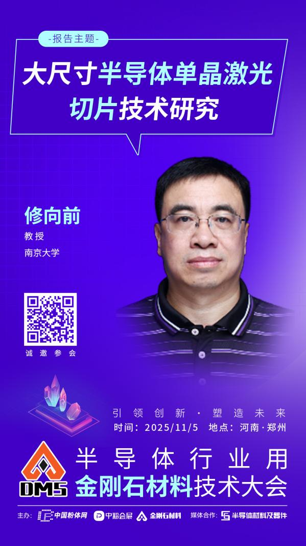 2025年11月5日,中國粉體網將在河南•鄭州舉辦“2025半導體行業用金剛石材料技術大會”。屆時,我們邀請到南京大學修向前教授出席本次大會并作題為《大尺寸半導體單晶激光切片技術研究》的報告,報告將介紹南京大學在大尺寸導電型/半絕緣型碳化硅晶錠的激光切片技術研究進展以及金剛石、氧化鎵和氮化鎵單晶的激光隱形切片技術。